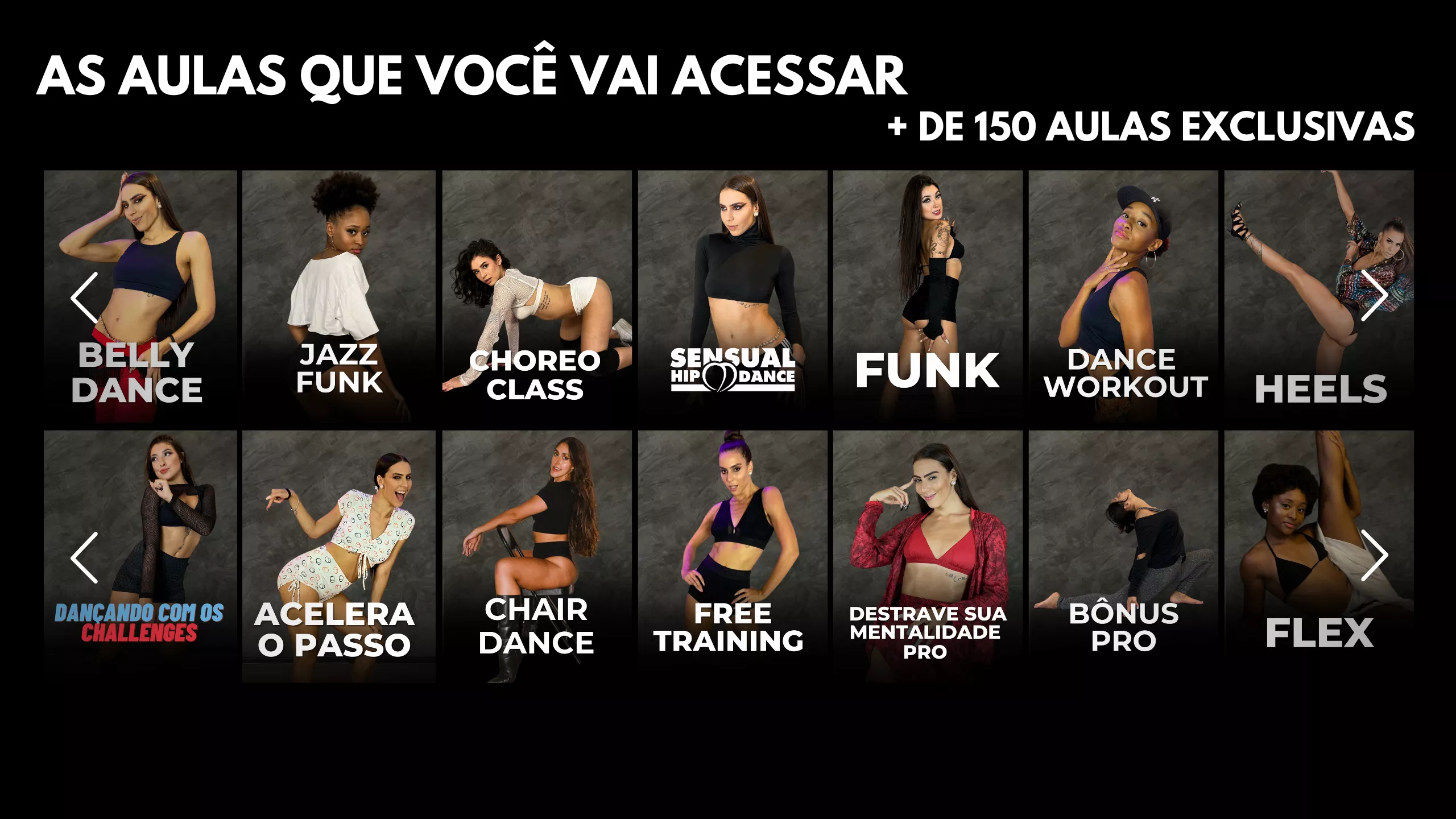 Não existe caminho mais acessível para dominar a dança com sensualidade do que a Pro Dance. Se você quer isso, nós criamos o melhor caminho do mercado. Não é necessário ser uma especialista para dançar como uma Grande Gostosa. Vamos te revelar técnicas certeiras e eficazes para que você se sinta confiante e poderosa. Cada aula é projetada para melhorar sua técnica, enquanto você se cuida e se diverte.
